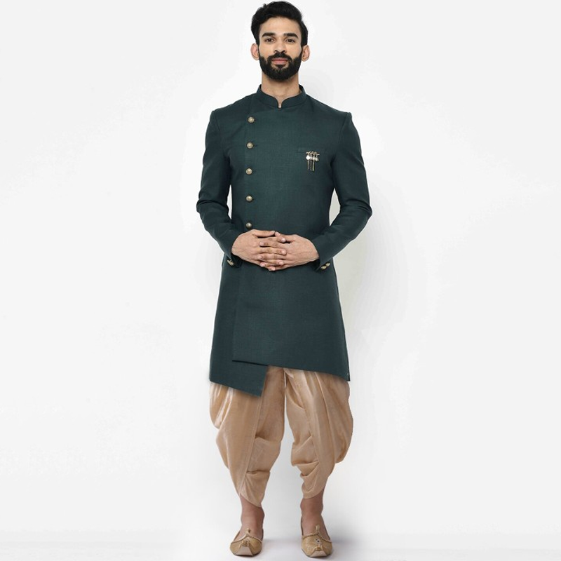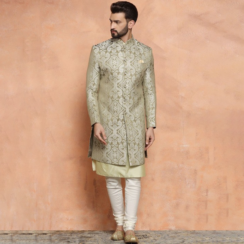 Men Olive-Green & Beige Solid Cotton Indowestern Sherwani Set